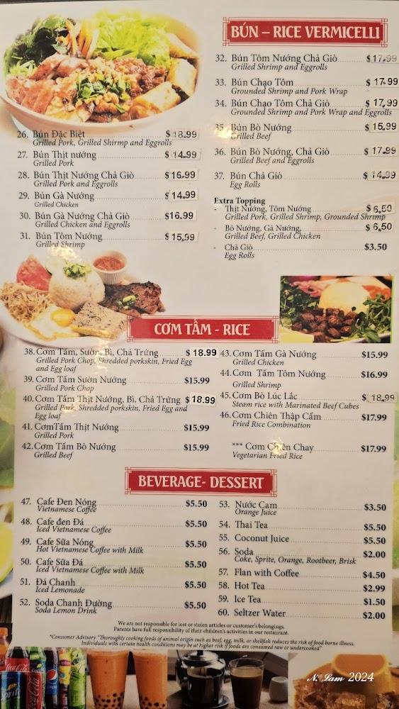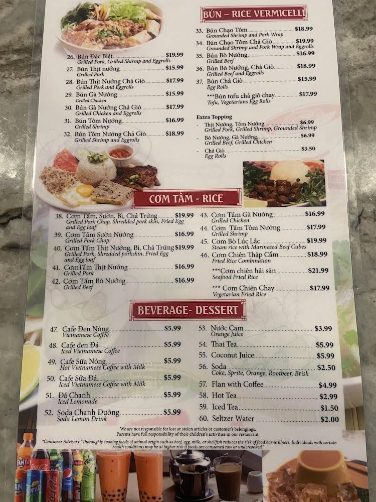 The menu at Pho Saigon III is extensive, showcasing a variety of Vietnamese dishes. Signature items include beef and chicken pho, along with crispy spring rolls. Vegetarian options, such as rice dishes and vegetables, cater to diverse diets. Each dish is prepared with fresh ingredients, embodying authentic flavors. The drink selection features Vietnamese coffee and refreshing boba tea. Affordable prices span $10 to $20, ensuring value for quality food.